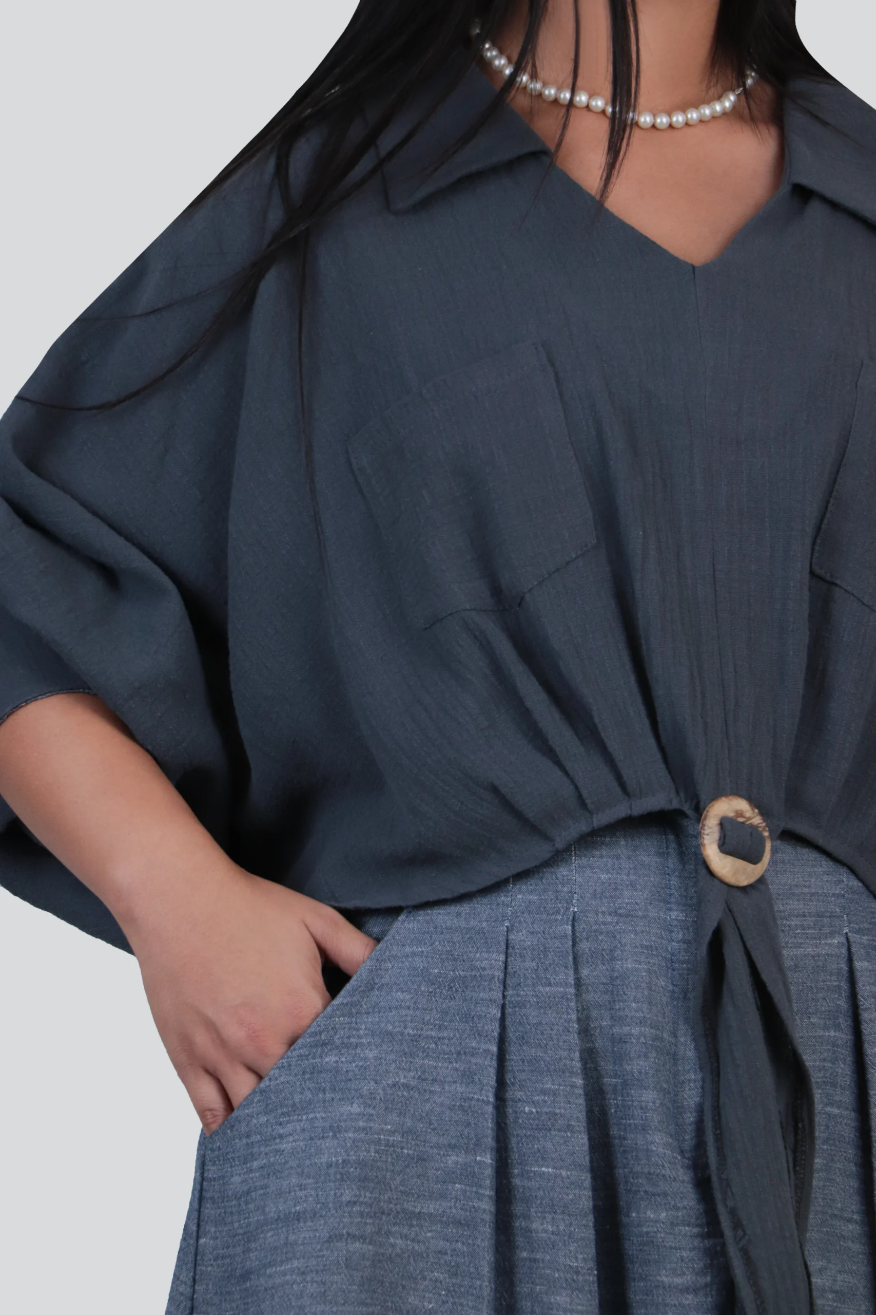 طراحی گره در قسمت جلوی شومیز، این مدل را از سایر مدلها متمایز میکند. ترکیب این شومیز با یک دامن ساده یا دامنهای طراحی شده، میتواند استایلی بینظیر برای مهمانیها، قرارهای دوستانه و حتی دورهمیهای خانوادگی ایجاد کند. این مدل هم برای استفاده روزانه و هم برای موقعیتهای نیمهرسمی بسیار کاربردی است. دامن این ست معمولاً طراحی سبک دارد که باعث میشود استایل شما جذابتر و در عین حال خنکتر باشد.